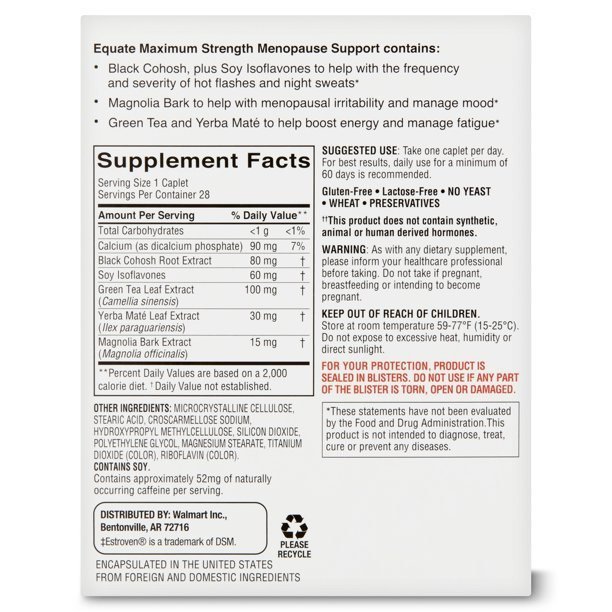 Equate Maximum Strength Menopause Support Dietary Supplement is a daily supplement that provides maximum strength support for those suffering from bothersome menopause symptoms. It contains black cohosh and soy isoflavones to help with the frequency and severity of hot flashes and night sweats. The magnolia bark helps with menopausal irritability and mood management; while green tea and yerba mate help to boost energy and manage fatigue. This drug- and estrogen-free dietary supplement does not contain gluten; lactose; yeast; wheat; preservatives; or synthetic; animal; or human derived hormones. For an affordable and effective drug-free solution for uncomfortable symptoms of menopause; regain control with Equate Maximum Strength Menopause Support Dietary Supplement.