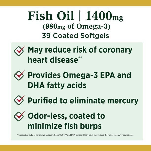 Nature's Bounty Fish Oil 1400 mg contains EPA and DHA; two Omega-3 fatty acids that help support and maintain the health of your cardiovascular system.* Omega-3 fatty acids are considered 'good' fats important for cellular; heart and metabolic health and help maintain triglyceride levels already within a normal range.* Because they’re from the trusted vitamin experts at Nature’s Bounty; these high-quality Fish Oil Softgels are purified to eliminate mercury. Odorless Fish Oil is coated to minimize the aftertaste and fish burps! Nature’s Bounty is committed to safety and purity in all our supplements. Our Omega-3 Fish Oil Softgels contain no shellfish. They are non-GMO; gluten- and sugar-free; and contain no artificial colors or sweeteners.