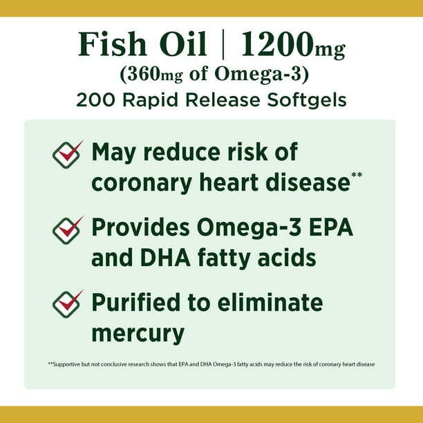 Nature's Bounty Fish Oil 1200 mg contains EPA and DHA; two Omega-3 fatty acids that help support and maintain the health of your cardiovascular system.* Omega-3 fatty acids are considered 'good' fats important for cellular; heart and metabolic health and help maintain triglyceride levels already within a normal range.* You work hard to take good care of yourself – so when it comes to getting your fish oil from a trustworthy source; let Nature’s Bounty take care of you!