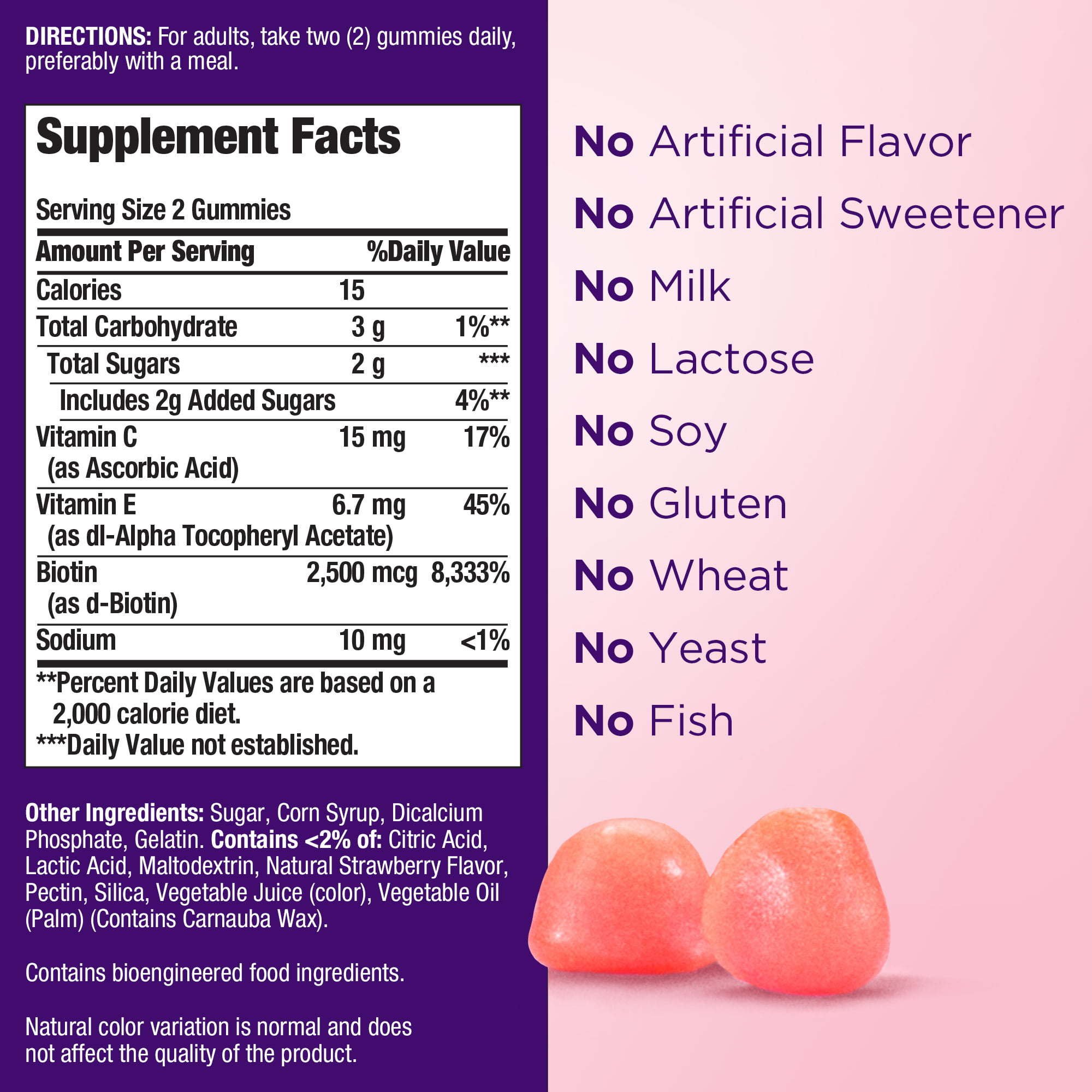 From the #1 brand for hair; skin; and nails; ◊ Nature's Bounty Hair; Skin & Nails Gummies contains with biotin and vital nutrients to support beautiful hair; glowing skin; and healthy nails from the inside out.* Each serving of our delicious strawberry-flavored biotin gummies contains antioxidants vitamin E and vitamin C.* Vitamin E contributes to skin health; vitamin C is involved in collagen production and formation; which forms the basis for vibrant skin; and biotin helps to maintain healthy hair.* Every Nature's Bounty beauty supplement is backed by a combination of nature and science; and made with the purest ingredients; guaranteed. Our unique formula is laboratory-tested plus is free of milk; lactose; soy; gluten; wheat; yeast; or fish. If you're hoping to look and feel your best; Nature's Bounty Hair; Skin & Nails vitamins for women are a great addition to your everyday beauty routine and a delicious way to support your natural beauty from within.* Packaging may vary