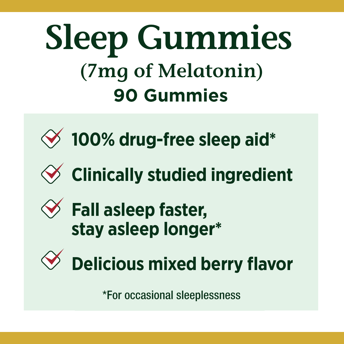Nature’s Bounty 7 mg Melatonin Gummies are a fun; delicious way to support a relaxed mood and restful sleep.* These mixed berry-flavored gummies provide you with 7 mg of Melatonin per serving. Melatonin; a clinically studied ingredient; works in harmony with your natural sleep cycle to promote relaxation and sound; restful sleep when experiencing occasional sleeplessness.* Get the support you need for occasional sleeplessness; jet lag; or simply an improved quality of rest with Nature's Bounty Melatonin Gummies! *These statements have not been evaluated by the Food and Drug Administration. This product is not intended to diagnose; treat; cure; or prevent any disease.