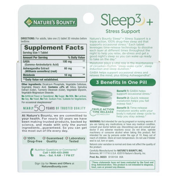 Nature's Bounty Sleep3 + Stress Support is a triple action; 100% drug-free sleep aid that supports occasional stress.* Each tablet leverages time-release technology to dissolve each layer at different times throughout the night to help you relax; de-stress and get a good night's sleep so you can wake up ready to take on the day.*