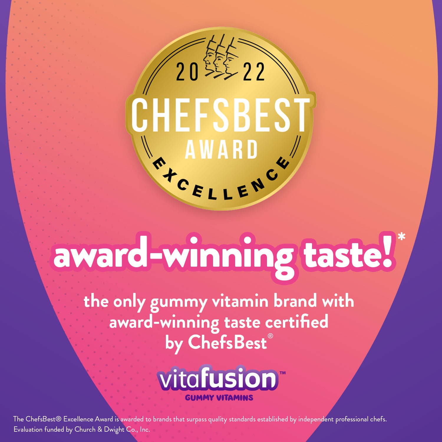 Three delicious vitafusion Power C gummies provide an excellent source of immune supporting[1] vitamin C* – as much as 10 tangerines! Each serving provides 282mg of high potency Vitamin C which is more than 100% of your recommended daily allowance. You’ll enjoy your vitamin C in a tangy orange flavor and feel good knowing that these vitamin C gummy vitamins are made with natural flavor. For over 12 years; we’ve been helping people to live happy and healthy lives with our gummy vitamins and supplements. Vitafusion is the only gummy vitamin brand with products that have been awarded the ChefsBest Excellence award for taste. [2] Anything is possible when great nutrition is your foundation. Take a fruitful step toward a healthier; happier world with America’s #1 gummy vitamin brand. Vitamin Better! [1] These statements have not been evaluated by the Food and Drug Administration. This product is not intended to diagnose; treat; cure or prevent any disease. [2] The ChefsBest Excellence Award is awarded to brands that surpass quality standards established by independent professional chefs.