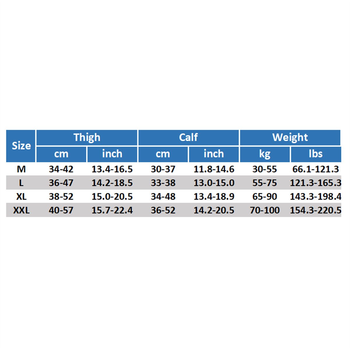 * Size: XXL----Thigh:40-57cm/15.7-22.4"----Calf:36-52cm/41.7"----Weight:70-100kg/154.3-220.5 lbs"