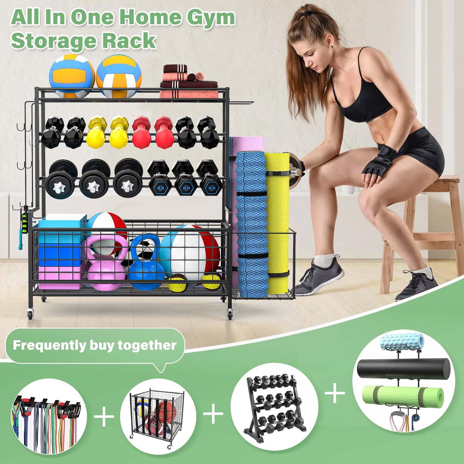Heavy duty casters: The home gym storage rack is equipped with 4 sturdy 360 degree wheels (2 lockable), making it easy to move indoors, outdoors, and anywhere you want to use.