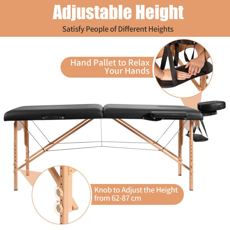 Adjustable height to fit therapists of different heightsFoldable and portable design for easy transportation and storageComfortable lying experience thanks to its high-density sponge and PVC leatherHold up to 441 lbs because of reinforced beech frame with support steel cablesIncluded headrest, armrests and hand pallet provide extra comfortSuitable for spa, massage, facial care, tattoo and foot massage, etcEasy installation with detailed instruction