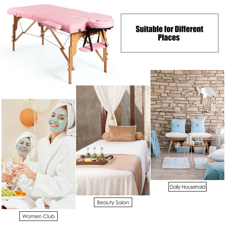 Adjustable height to fit therapists of different heightsFoldable and portable design for easy transportation and storageComfortable lying experience thanks to its high-density sponge and PVC leatherHold up to 441 lbs because of reinforced beech frame with support steel cablesIncluded headrest, armrests and hand pallet provide extra comfortSuitable for spa, massage, facial care, tattoo and foot massage, etcEasy installation with detailed instruction