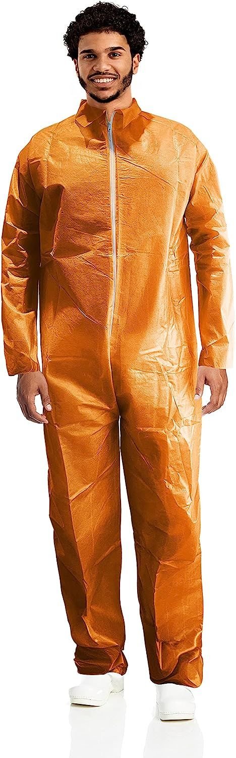 Home > Hazmat Suits Disposable Coveralls XX-Large. Pack of 5 Orange Non Hooded Coveralls for Men and Women. Polypropylene Polyethylene 40 GSM Paint Suit Cove