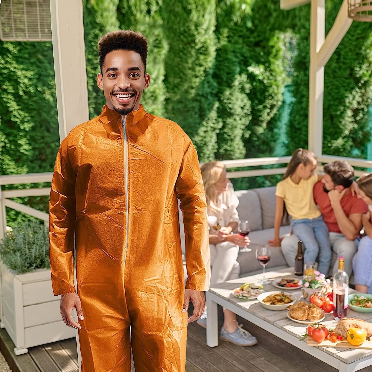 • Cover the torso; fit comfortably over the body; protect skin and have long sleeves. Orange disposable coverall provides economical; comfortable and reliable protection for practitioner hygienic security. No pockets help to keep the cost low. This unisex protective clothing can be used for such activities as manufacturing; mold remediation; cleaning; plumbing; construction; painting or during a major cleanup that contains mold or dirt.