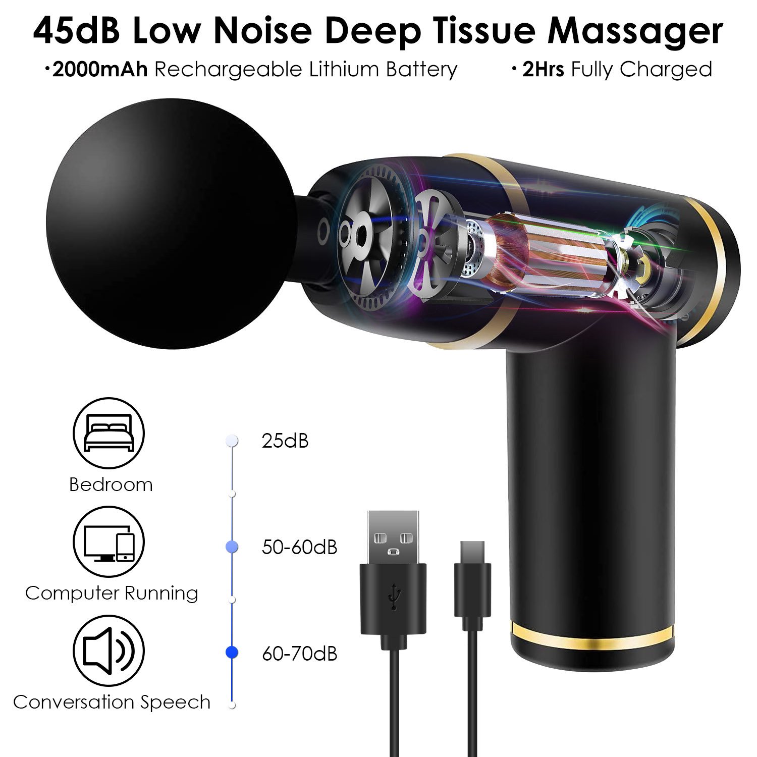 *45dB Low Noise & Cordless*:Use this cordless rechargeable percussion massager anytime you want!Despite its robust power; it is equipped with an extra silent brushed motor which operates 45 dB only.