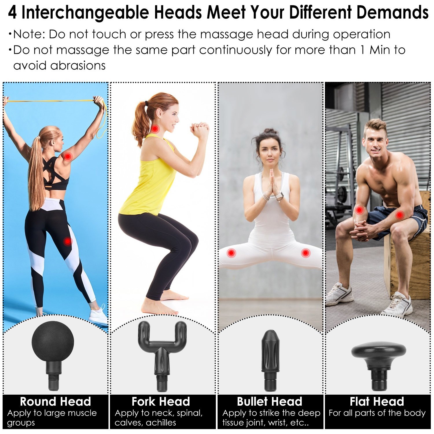 3. Do not touch or press the massage head during operation; beware of hair being caught into the massage gun.
