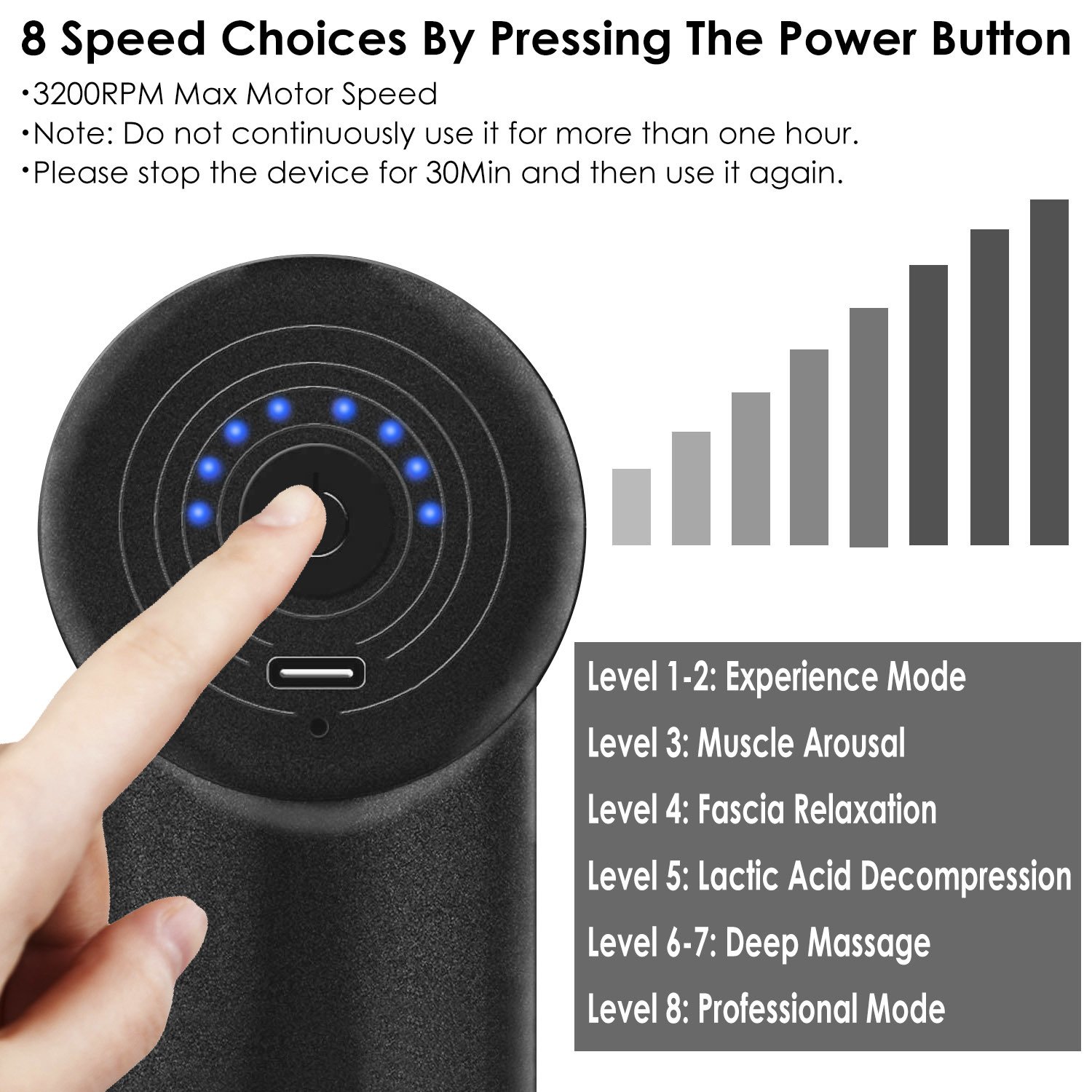 *Deep Tissue Massage*:Powerful gun massager with 8 level massage intensities that produces up to 3200 rpm blaster to work on different body tissues and muscles. It is a perfect tool to therapy muscle or joints issues; muscle pain relief and relaxing which is necessary to improve your health.
