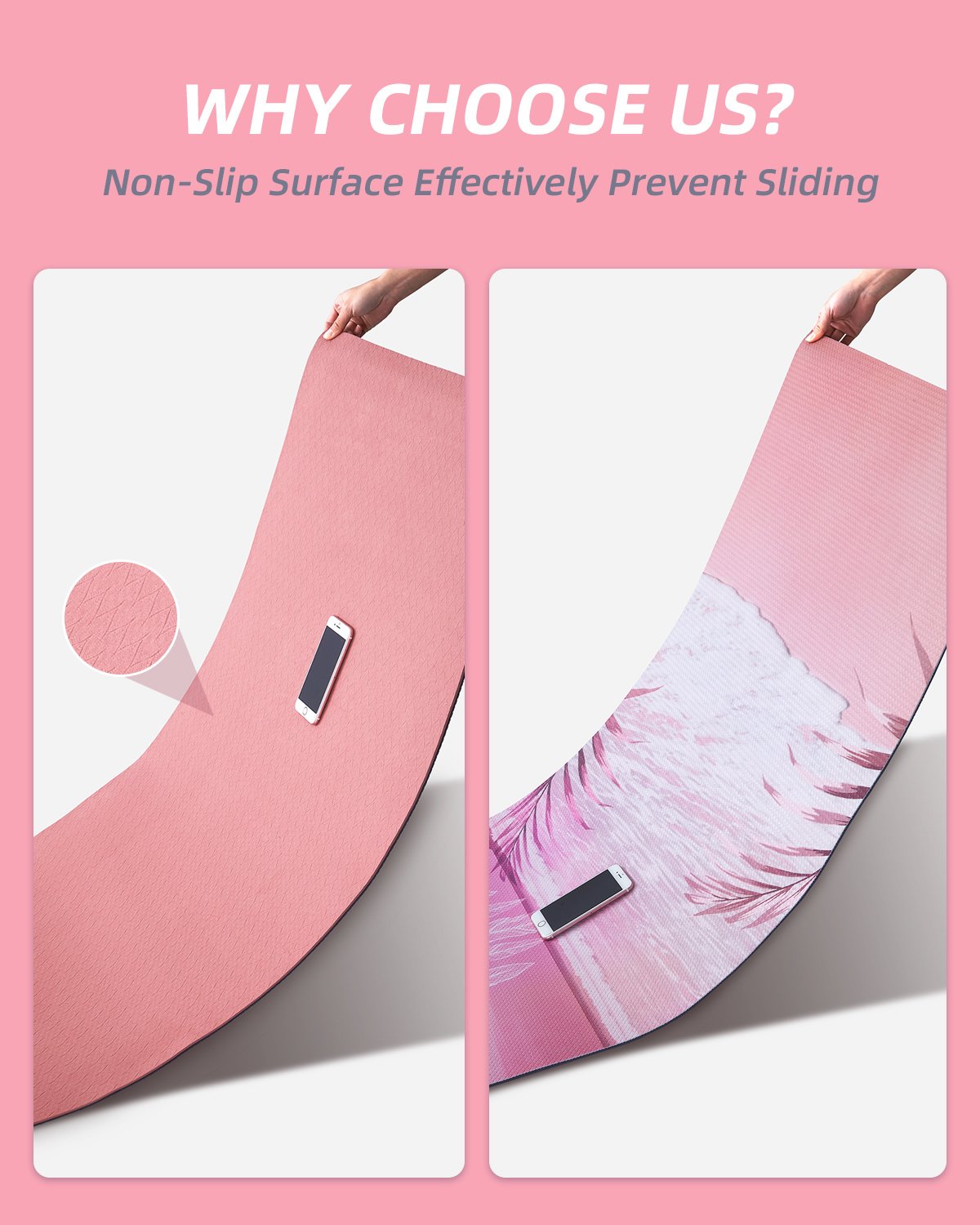 The design of anti-skid texture on both sides and Hexagon texture(unique patented non-slip pattern) on the back, features good cushioning and optimal grip. The yoga mat non slip shows the excellent anti-slipping on all kinds of grounds, for example, wood floor, cement floor,tile floor.