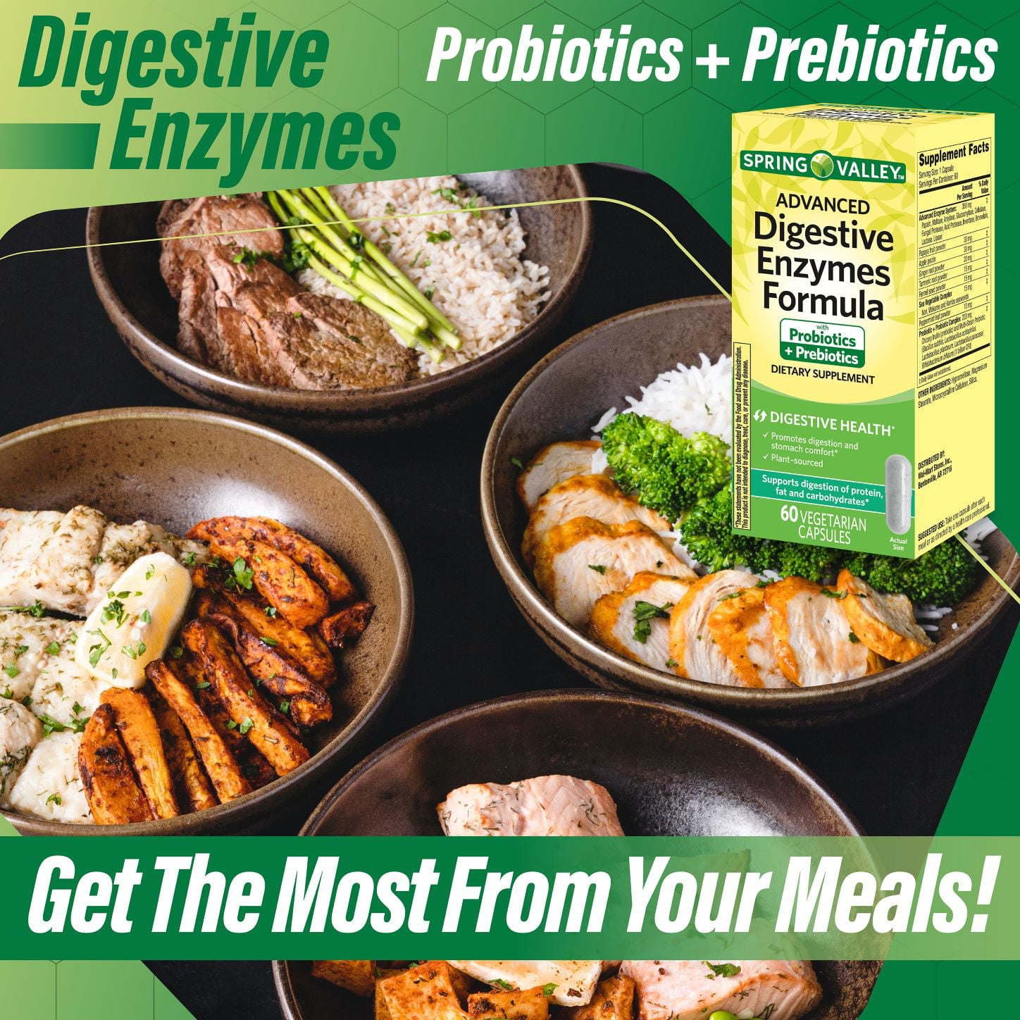 ADVANCED DIGESTIVE ENZYMES SYSTEM. Each serving of Spring Valley Advanced Digestive Enzymes Capsules provides a highly effective blend of 11 digestive enzymes to promote healthy digestion and maximum nutrient absorption. These include amylase for carbohydrate breakdown; protease for proteins and lipase for fats.