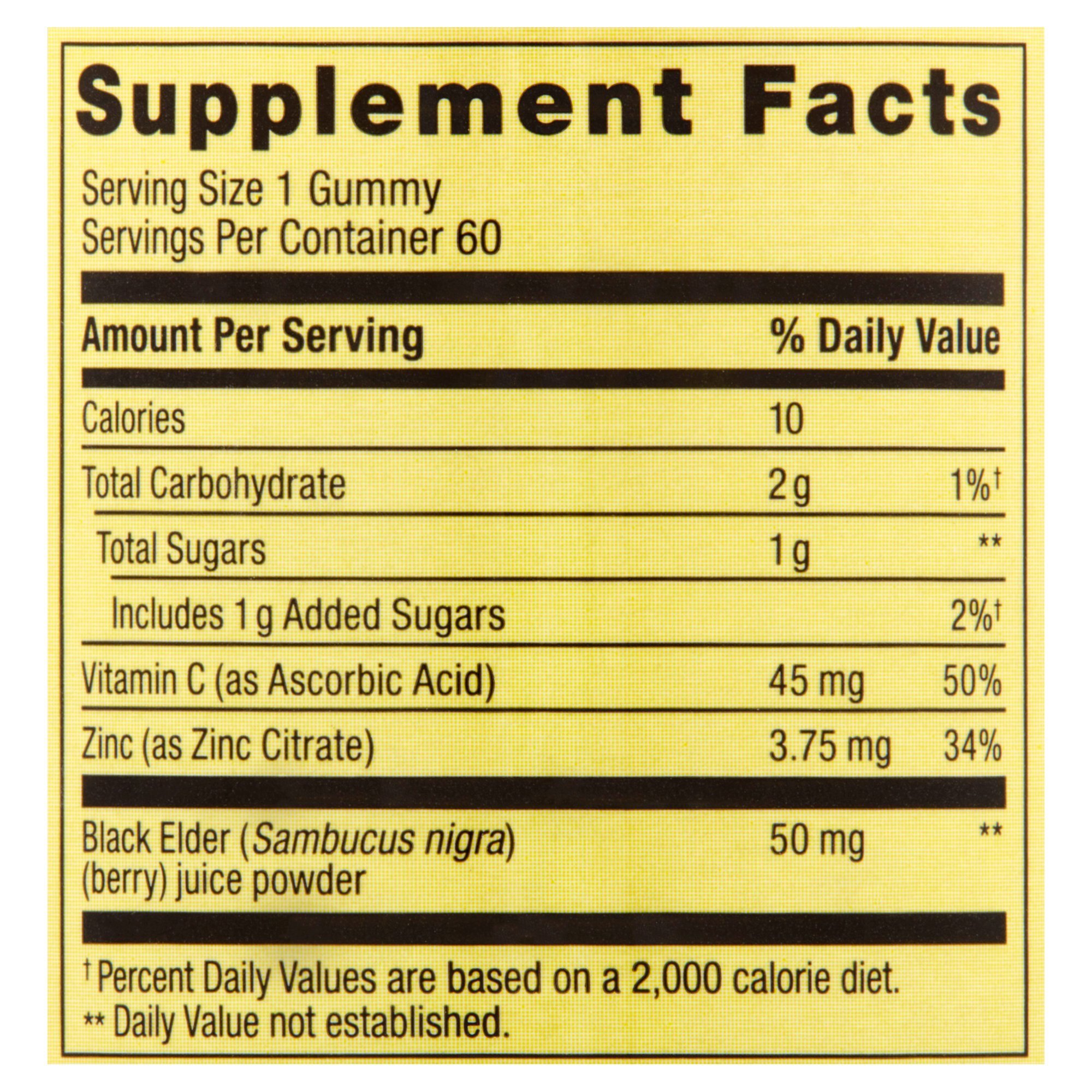 Spring Valley Elderberry Dietary Supplement; Adult Gummies; 60 ct are the simplest; best-tasting way to take elderberry and help support the immune system. Our delicious and easy to chew gummies make taking your daily elderberry a joy. Spring Valley understands living a healthy; balanced lifestyle is the key to being your best self. With a commitment to using only the highest quality ingredients; Spring Valley gummies are a simple and delicious addition to your daily routine that you can feel good about. Our affordable range of high-quality products supports you and your family's health and holistic wellbeing. Non-GMO Spring Valley Vegetarian Elderberry Gummies contain 50mg of Black Elder per serving.
