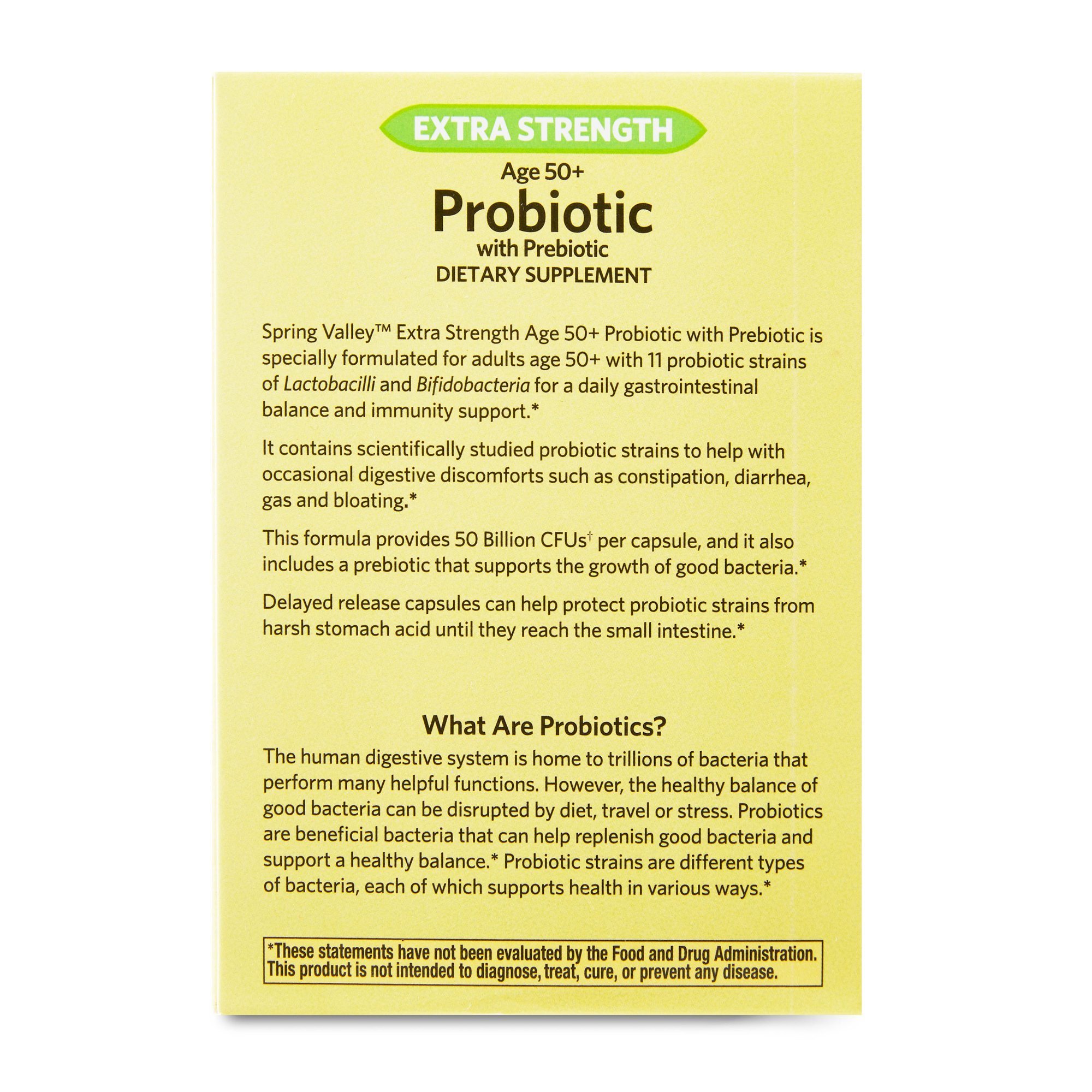 Spring Valley Extra Strength 50+ Probiotic with Prebiotic is specially formulated for adults 50+ with 11 probiotic strains of Lactobacilli and Bifidobacteria for a daily gastrointestinal balance and immunity support.* It contains scientifically studied probiotic strains to help with occasional digestive discomforts such as constipation; diarrhea; gas and bloating.* This formula provides 50 Billion CFU†s per capsule; and it also includes a prebiotic that supports the growth of good bacteria.* Delayed release capsules can help protect probiotic strains from harsh stomach acid until they reach the small intestine.*