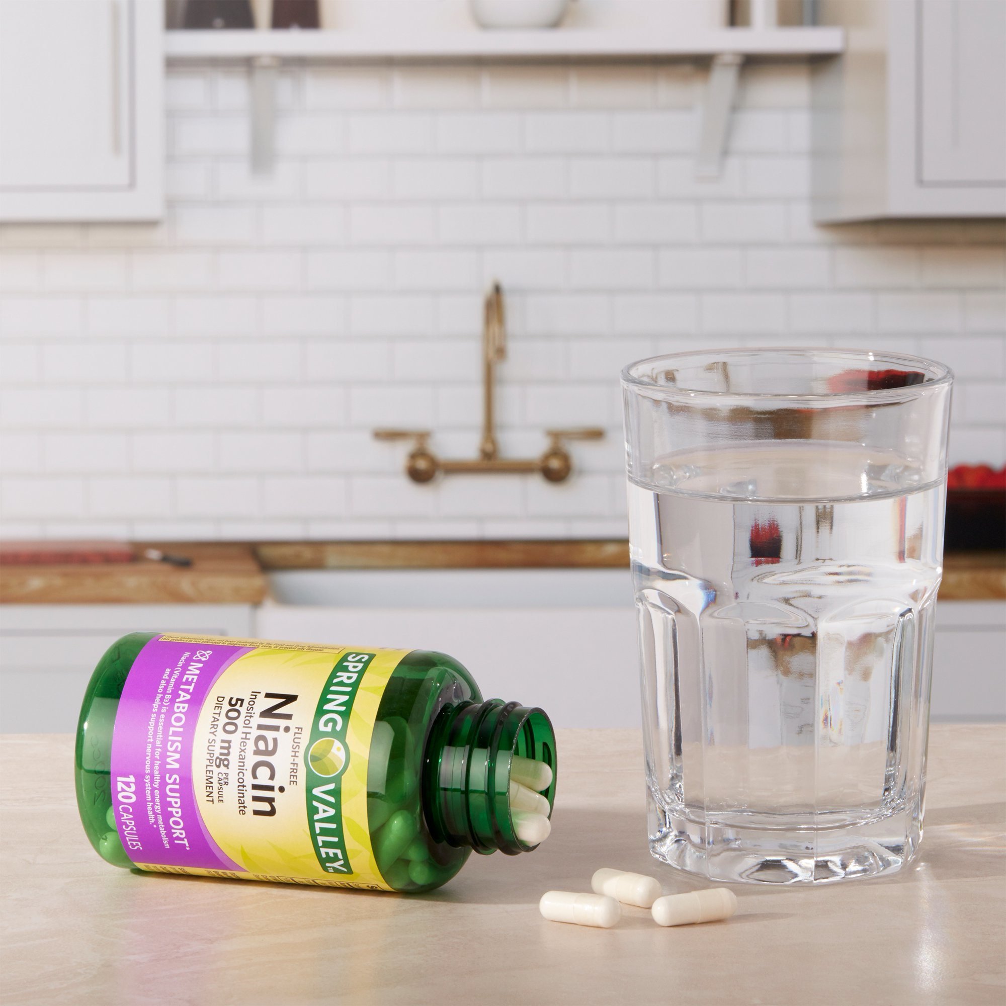 Spring Valley Niacin Inositol Hexanicotinate Dietary Supplement; 500 mg is a dietary supplement formulated to promote metabolism support. Niacin (vitamin B3) is essential for a healthy metabolism and also helps support nervous system health. The suggested adult dosage is one capsule daily; preferably with a meal. These capsules contain no gluten; yeast; wheat; milk; lactose; sugar; soy; preservatives; artificial flavors; or artificial colors and each serving contains less than 5 milligrams of salt. You can rest assured that Spring Valley Niacin Inositol Hexanicotinate Dietary Supplement; 500 mg; is produced with strict quality guidelines and is backed by a quality guarantee.