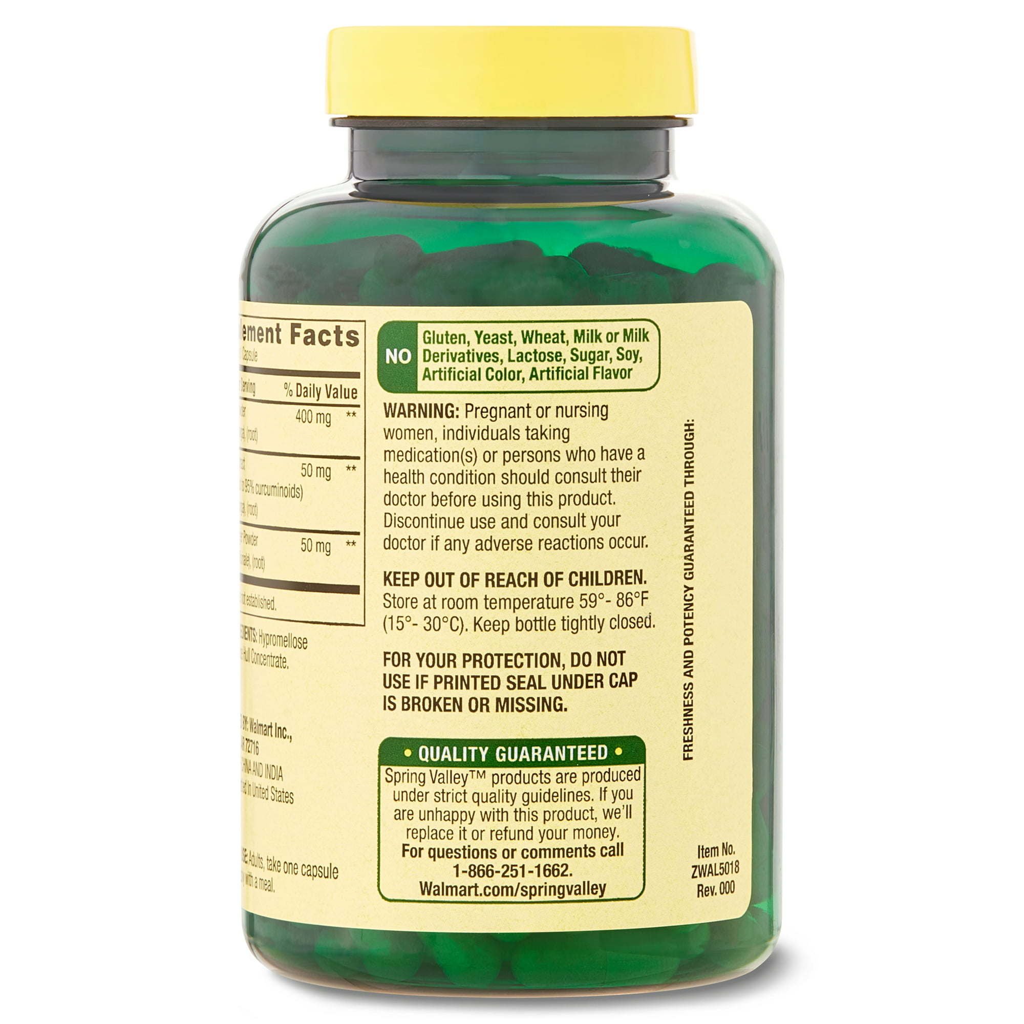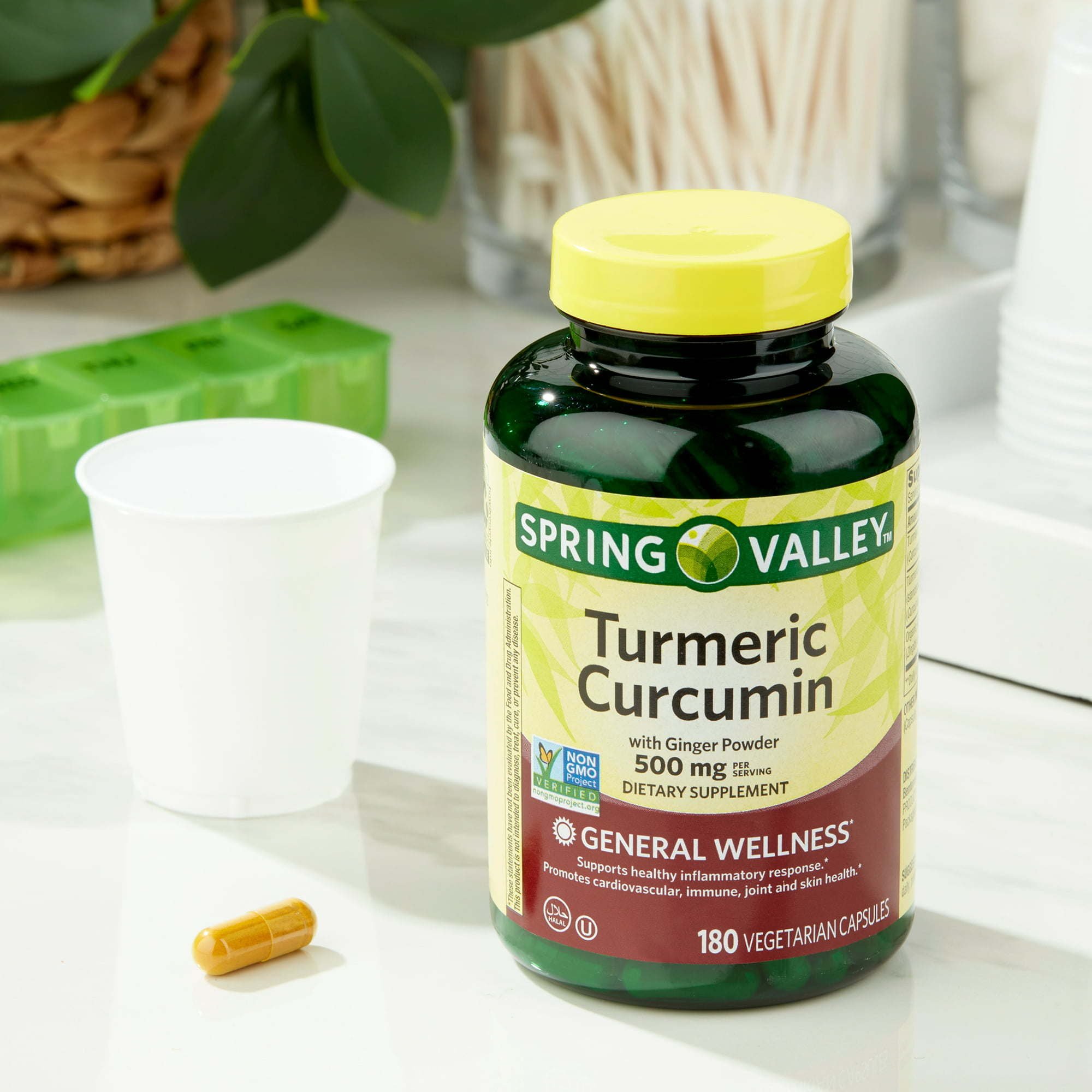Spring Valley Turmeric Curcumin with Ginger Powder Dietary Supplement; 500 mg is a general wellness support supplement that promotes cardiovascular; immune; joint; and skin health; as well as healthy inflammatory response. The suggested adult dosage is one vegetarian capsule daily; preferably with a meal. These capsules contain no gluten; yeast; milk and milk derivatives; lactose; soy; or sugar and are free of artificial colors or flavors. You can rest assured that Spring Valley Turmeric Curcumin with Ginger Powder Dietary Supplement; 500 mg is produced with strict quality guidelines and is backed by our quality guarantee.