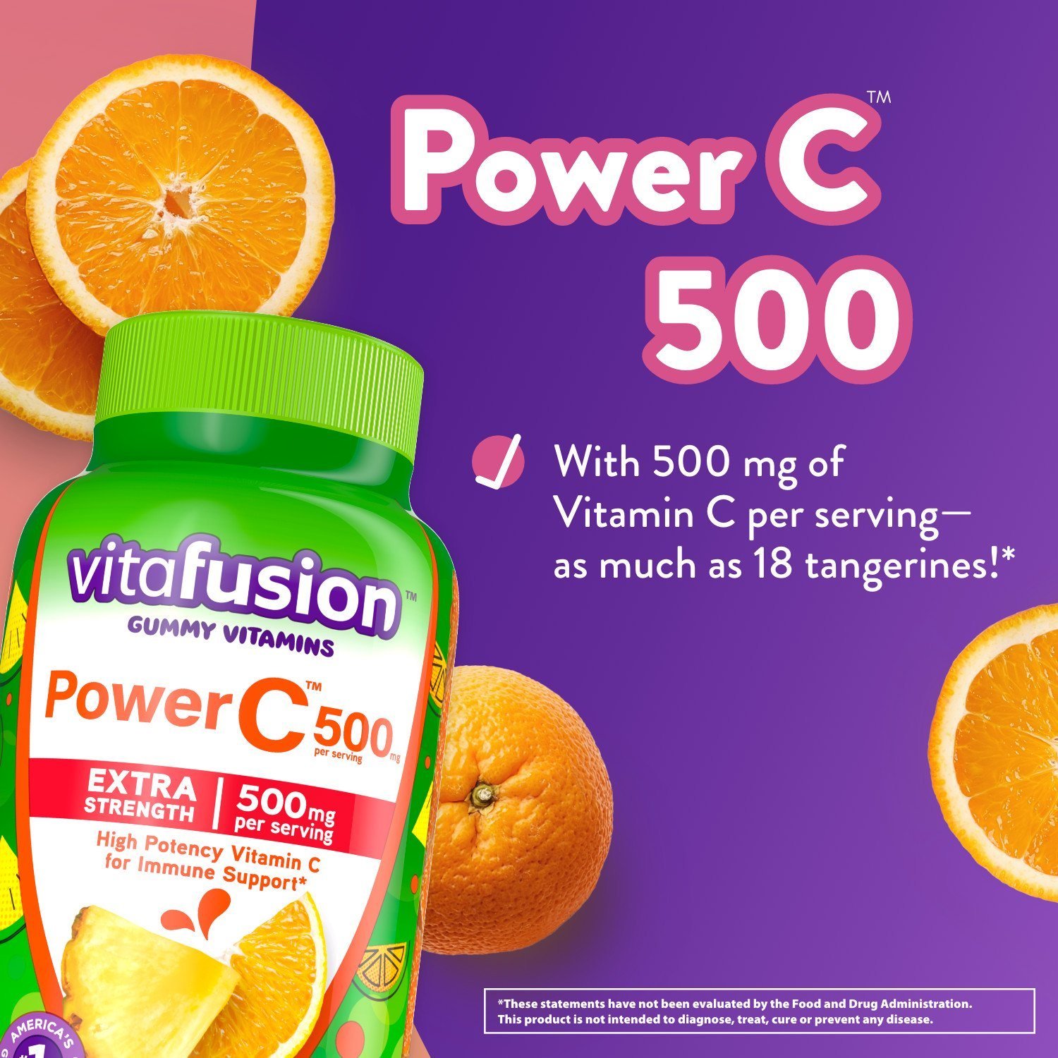 vitafusion Extra Strength Power C Gummy Vitamins are daily dietary supplements that provide high-potency Vitamin C. Each vitamin gummy serving provides 500 milligrams of Vitamin C for immune support (1) and as much Vitamin C as 18 tangerines. Each high-potency Vitamin C gummy vitamin is also made with no artificial flavors or sweeteners; no gluten; no high fructose corn syrup; no dairy and no synthetic FD&C dyes. Plus; these extra strength Vitamin C gummies come in a delicious natural tropical citrus flavor. This gummy dietary supplement provides a great tasting and convenient alternative to traditional; hard-to-swallow vitamin pills. Look forward to your daily dose of Vitamin C with a vitafusion Power C gummy. This 92 count bottle of gummy immune support (1) vitamins ensures you’ll have enough to last you 23 days. vitafusion is the only gummy vitamin brand with products that have been awarded the ChefsBest Excellence award for taste; these Vitamin C gummies were the recipient of the 2021 ChefsBest Excellence Award (2). Take a fruitful step toward a healthier; happier world with America’s #1 gummy vitamin brand. (1) These statements have not been evaluated by the Food and Drug Administration. This product is not intended to diagnose; treat; cure or prevent any disease. (2) The ChefsBest Excellence Award is awarded to brands that surpass quality standards established by independent professional chefs. Evaluation funded by Church & Dwight Co.; Inc.
