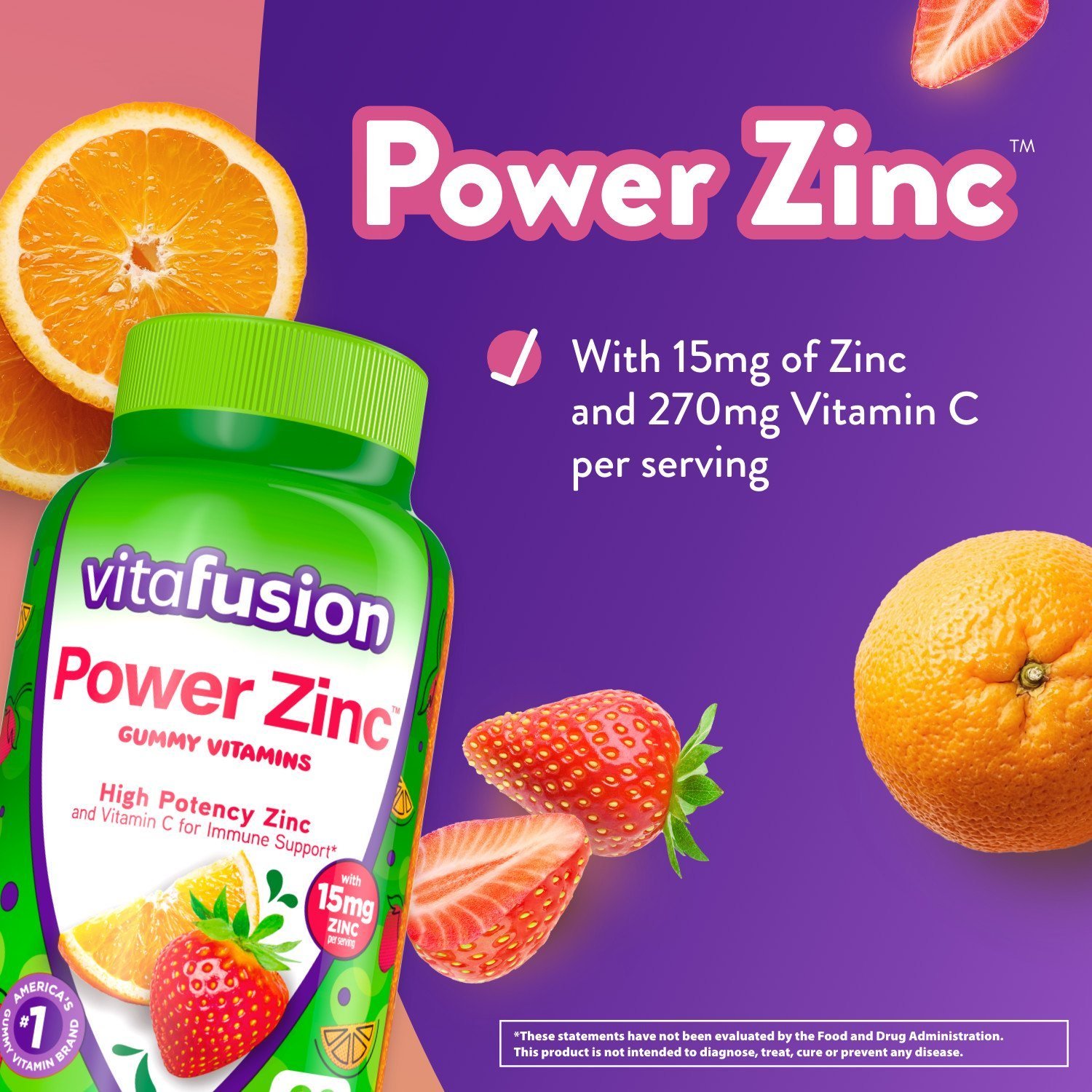 vitafusion Power Zinc Gummy Vitamins are a dietary supplement specially formulated with your health in mind. Each two-gummy serving of these Zinc supplement vitamin gummies contains 15 milligrams of high potency Zinc and 270 milligrams of Vitamin C to help with immune support (1). These vitamin gummies come in a delicious natural strawberry tangerine flavor. These Zinc supplement adult gummy vitamins provide a great tasting and convenient alternative to traditional; hard-to-swallow vitamin pills. Each flavorful and nutritious vitamin gummy is made with no artificial flavors or sweeteners; no gluten; no high fructose corn syrup; no dairy and no synthetic FD&C dyes. Look forward to your daily dose of Zinc with vitafusion Zinc gummies. This 90 count bottle of gummy immune support (1) vitamins ensures you’ll have enough to last you 45 days. vitafusion is the only gummy vitamin brand with products that have been awarded the ChefsBest Excellence award for taste; these Zinc gummies were the recipient of the 2021 ChefsBest Excellence Award (2). Take a fruitful step toward a healthier; happier world with America’s #1 gummy vitamin brand. (1) These statements have not been evaluated by the Food and Drug Administration. This product is not intended to diagnose; treat; cure or prevent any disease. (2) The ChefsBest Excellence Award is awarded to brands that surpass quality standards established by independent professional chefs. Evaluation funded by Church & Dwight Co.; Inc.